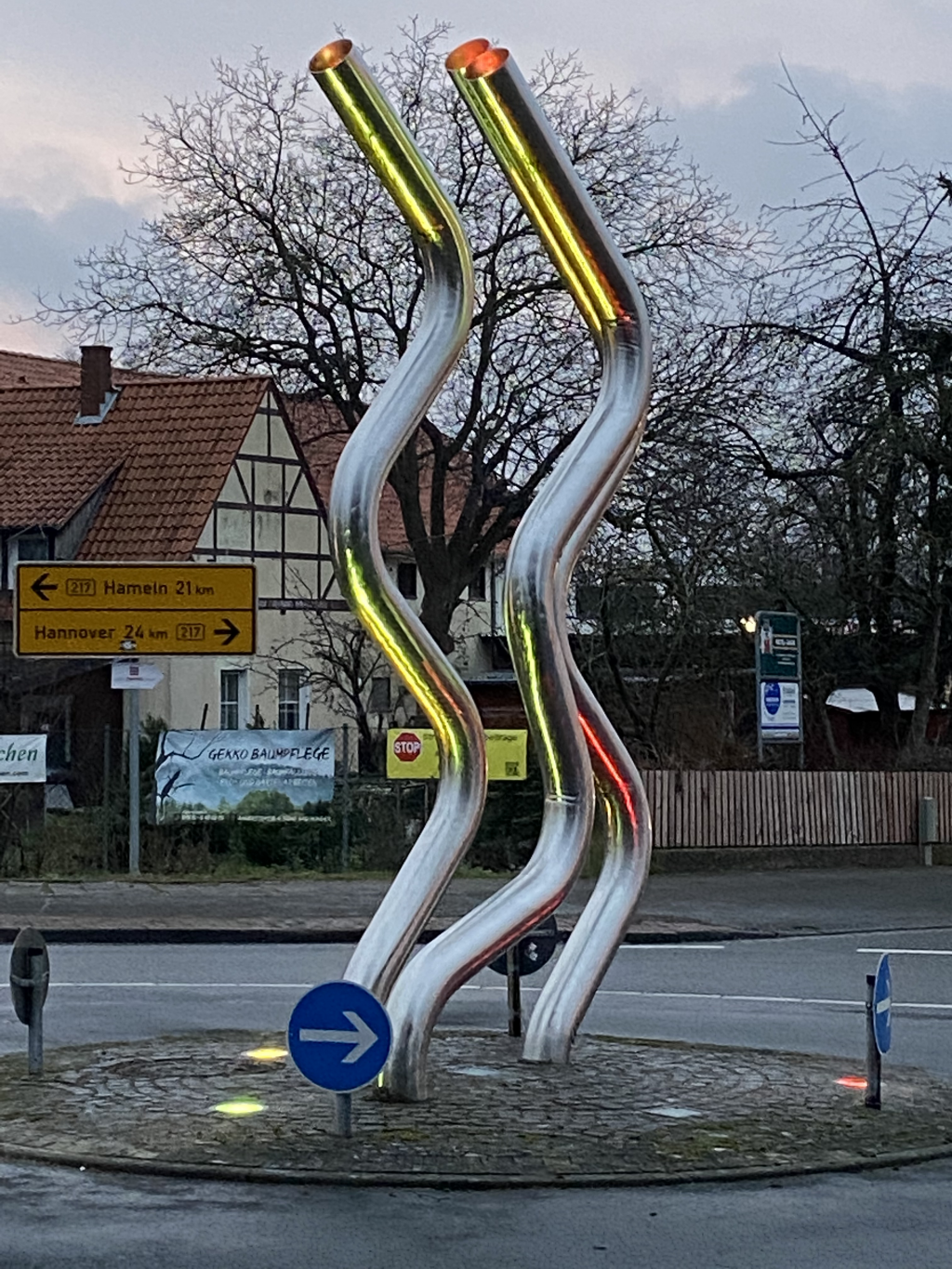 Gemeint sind damit die drei gebogenen Stelen, die der Springer Künstler, Schmied und Edelstahl-Verbieger Andreas Rimkus für den Kreisel im Ortseingang des Städtchens geschaffen hat. Nach ein paar unbeleuchteten Jahren erstrahlen diese jetzt ab sofort tageszeitabhängig dank einer SOUNDLIGHT Stand-Alone-Steuerung in traumhaft schönen, dynamischen Farblichtwechseln. Aber bitte nicht am Lenkrad träumen: manchmal ist nämlich im Kreisel mehr Verkehr als gerade hier auf unserem Foto.