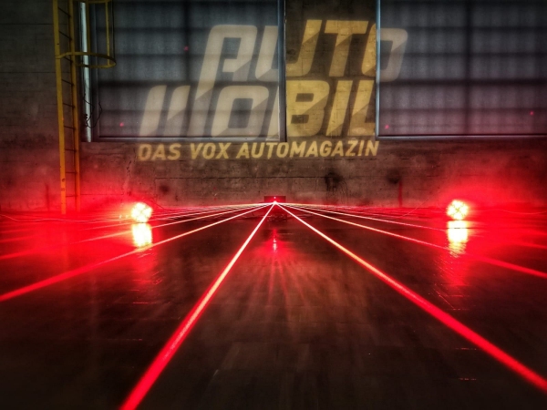 Die Auffahrt eines Automobils wird mit LED und Laser dynamisch in Szene gesetzt, und so kann die Aufnahme starten. Der Kameramann ist irritiert: tatsächlich völlige Ruhe. Kein Flackern in der Kamera. Wie das, wo sonst doch immer Probleme mit dem LED-Licht an der Tagesordnung sind?