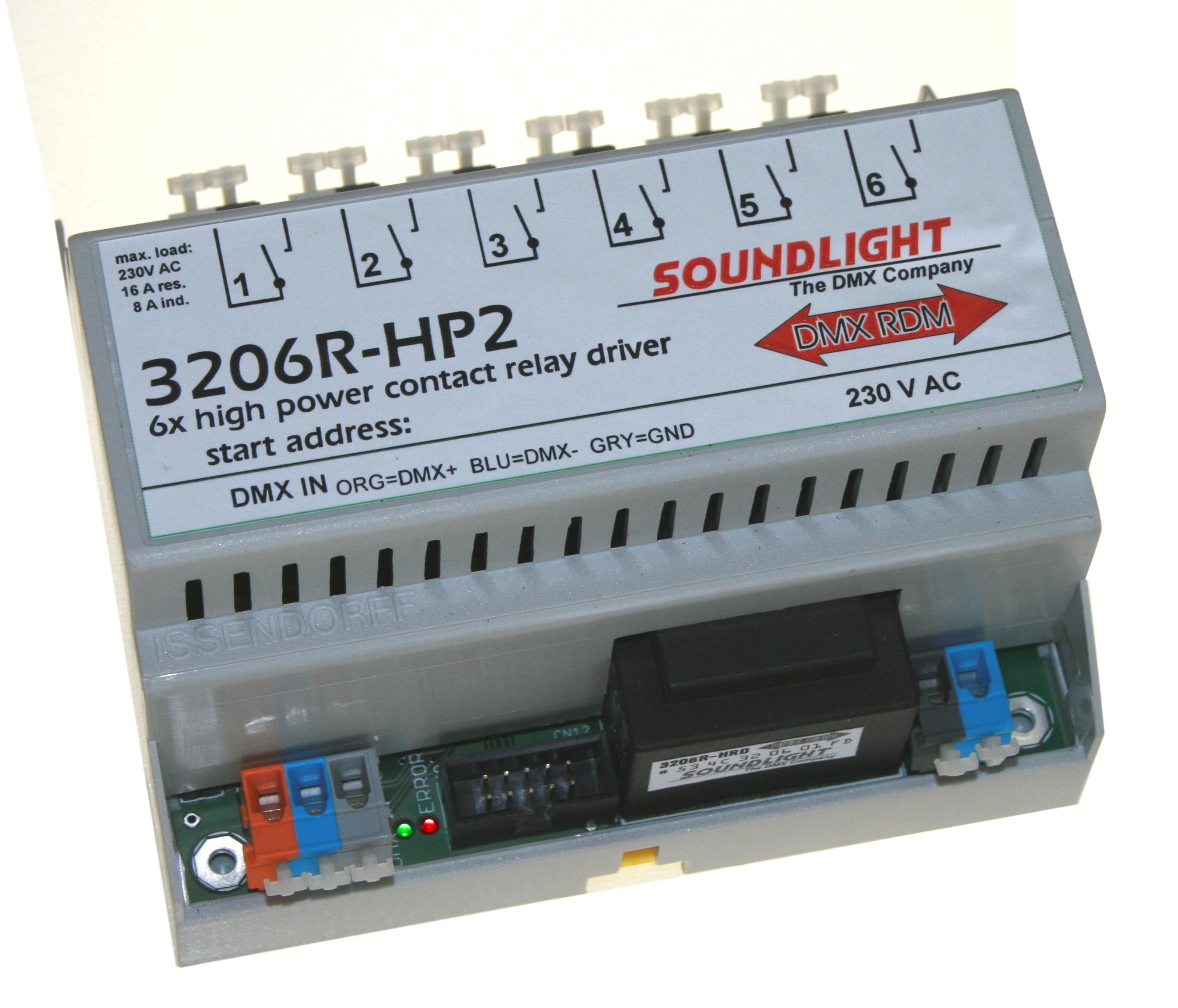 Unsere DMX Relaiskarten arbeiten so zuverlässig, dass sie zunehmend auch von OEM-Partnern in Schaltanlagen verbaut werden. Wir haben dem Rechnung getragen und eine Version der 3206R-H herausgebracht, die mit speziellen Hochlastrelais mit extra hohem Einschaltstrom-Handling bestückt ist. So können ein Dauerstrom von 16A und ein Einschaltstrom von 80A bewältigt werden.