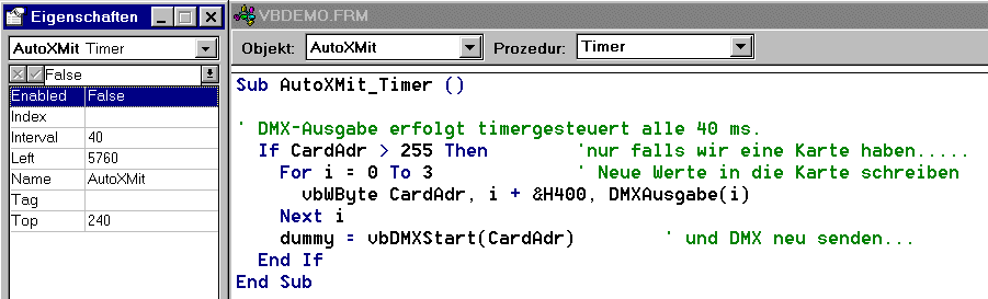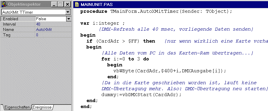 Setzen Sie die Timer-Eigenschaft ENABLED zunächst auf FALSE. Der Timer wird erst dann freigegeben, wenn eine Karte tatsächlich im System gefunden worden ist und die DMX-Übertragung gestartet wird. Zum Stoppen der Übertragung genügt es dann, den Timer einfach wieder abzuschalten.