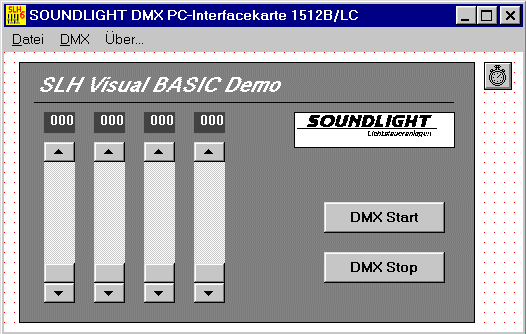 Sie haben eine SOUNDLIGHT DMX PC-Karte 1512B oder wollen sich eine zulegen? Gut, dann sollen Sie sie ja auch benutzen können. Die Karte ist wahrlich universell: sie läßt sich sehr einfach mit allen Sprachen - Assembler, DOS BASIC, PASCAL, C, den visuellen Programmieroberflächen Visual Basic, DELPHI und Visual C++ bedienen. Am meisten Spaß machen natürlich die visuellen Oberflächen unter Windows, weil Sie sich um Grafik fast nicht kümmern müssen: die ist schon komplett vorhanden und eine ganze Menge Systemfunktionalität gibt's auch fertig- man kann sich also voll und ganz auf die eigentliche Aufgabe, die Lichtsteuerung, konzentrieren.