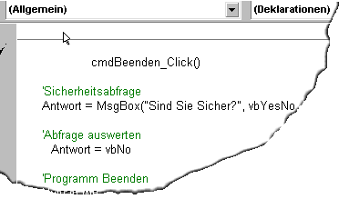 Sie declarieren die Variable indem Sie "Dim Antwort As Byte" am Anfang der Prozedur "Private Sub cmdBeenden_Click()"
