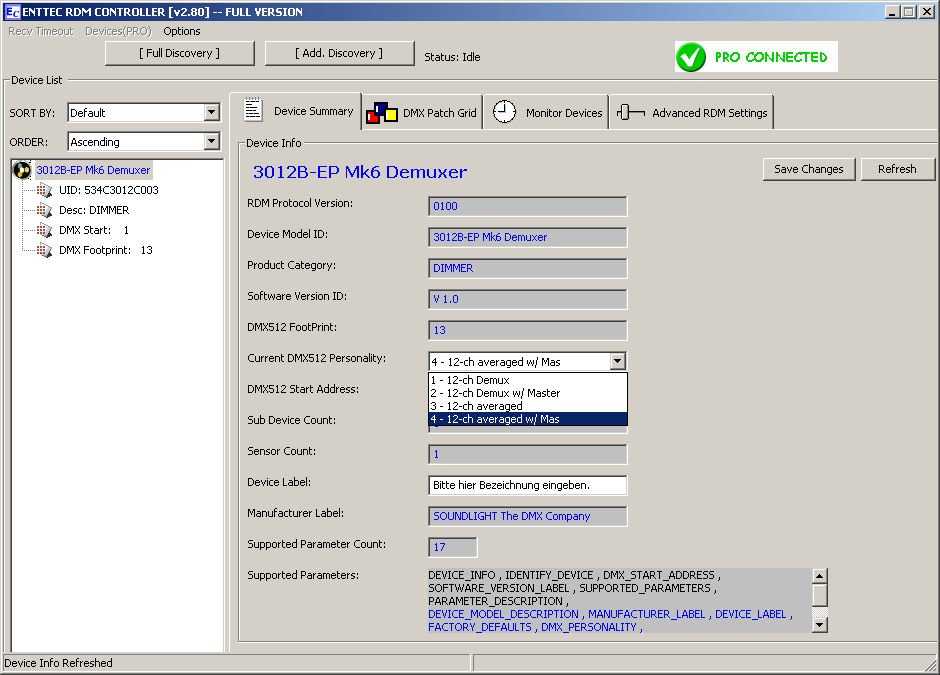 DMX PERSONALITY Es stehen 4 Personalities als 12-Kanal und als 13-Kanal Modus zur Verfügung. Dabei kann der Demultiplexer wahlweise mit oder ohne gemeinsamen Masterkanal betrieben werden. Die DMX Startadresse läßt sich jederzeit frei einstellen. Aufgenommen mit JESE GET/SET RDM CONTROLLER |