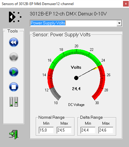 POWER SUPPLY VOLTAGE The voltage sensor monitors the internal power supply voltage and comprises of a (resettable) long-term recording (Min/Max). Recorded using JESE GET/SET RDM CONTROLLER |