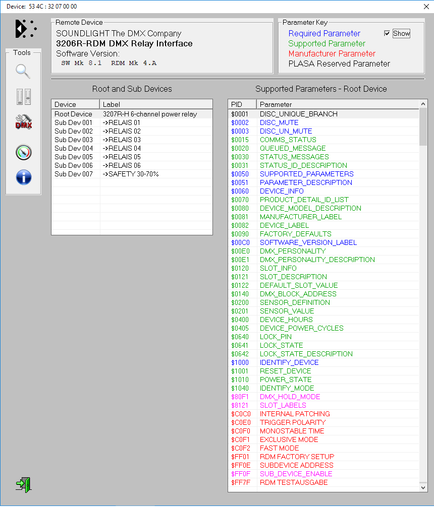 Mehr Informationen über DMX RDM erhalten Sie auf unserer Website www.dmxrdm.eu/rdm, auf der Sie auch eine Erläuterung der SOUNDLIGHT-spezifischen RDM Kommandos finden können. Zum Vergrößern der Abbildungen klicken Sie bitte einfach auf das jeweilige Bild. | For more information regarding DMX RDM pls refer to our website www.dmxrdm.eu/rdm, where you will find application examples as well as a description of the SOUNDLIGHT-specific RDM commands. To enlarge the images, simply click the image. | |||