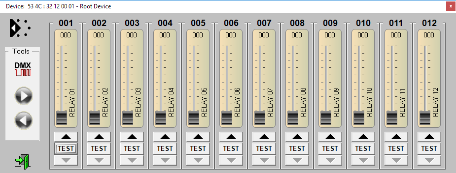 Zur Bedienung werden 12 DMX Kanäle belegt. Die Relais schalten, sobald die obere Schaltschwelle überschritten wird, und schalten zurück, sobald die untere Schaltschwelle erreicht wird. Damit ist jederzeit ein sicheres Schaltverhalten garantiert. Jedes Relais bedient einen Einschaltkontakt. Diese lassen sich einfach schalten, und lassen sich, falls die Relais gegenseitig verriegelnd schalten sollen, auch in Reihe schalten (z.B. für Motorsteuerung). So ist sichergestellt, dass jeweils nur ein Ausgang spannungsführend ist.