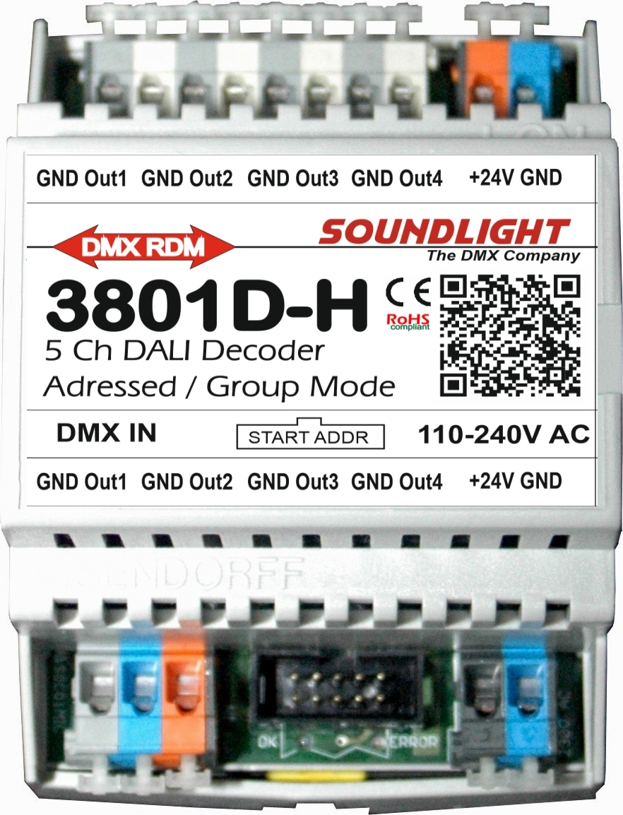 Zum Einsatz in der Gebäudetechnik ist das Interface 3801D-H schalterlos ausgeführt. Die notwendige Einstellung der DMX Startadresse wird durch Einprogrammierung ersetzt, die der Anwender per DMX RDM selbst vornehmen kann. Ein passendes Schalterinterface 3000P steht zur manualellen Eingabe als Zubehör zur Verfügung (getrennt bestellen!) Der 3801D-H unterstützt DALI (Digital Addressable Lighting Interface) und kann bis zu 5 DALI Teilnehmer über Einzeladressen (1-5) oder Gruppenadressen (1-5) ansprechen. Der 3801D-H ist DMX RDM kompatibel. Damit ist der Decoder sowohl mit Standard DMX als auch mit dem neuen, bidirektionalen DMX512 bedienbar. Mehr Infos zur DMX RDM erhalten Sie unter www.dmxrdm.eu Der 3801D-H bedient 5 Adressen, jeder Ausgang kann mit bis zu max. 8 EVG beschaltet werden.