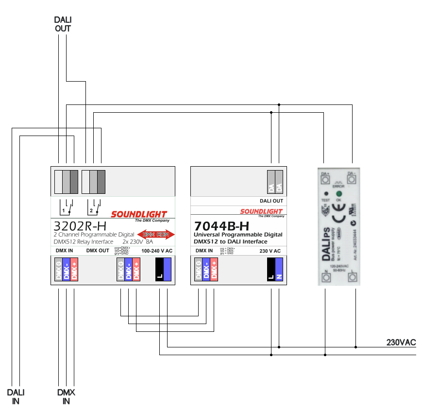 - To make a existing DALI system DMX controllable, the 7044B-H is used to replace the existing DALI controller (temporarily) and takes
