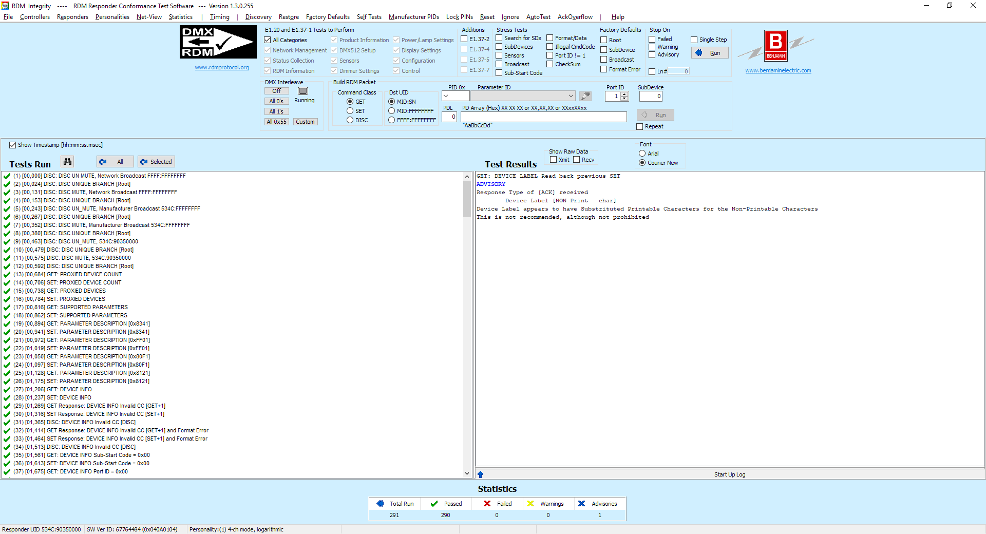 The RDM integrity test checks all RDM calls using 291 tests. The result speaks for itself: all passed (Advisory is a comment, but passed!).