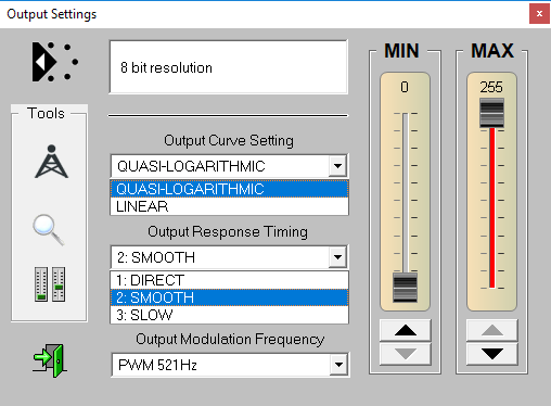 intensity increase along the fader travel. To match low-cost-driver performance, the characterisctic can be reset to linear behaviour.