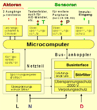 Der neue Ansatz heißt: dezentrale Technik, also verteilte Intelligenz. Schaltfunktionen direkt dorthin bringen, wo sie gebraucht werden, nämlich direkt an die zu steuernden Geräte und die erforderliche Entscheidungslogik dort auch gleich einbauen. Weil weder Lampen noch Leuchten, Rolladenmotore oder Frischluftventilatoren über solche Steuermöglichkeiten verfügen, muß man sie ihnen beigeben und eine Vernetzung der Steuermodule durchführen, damit die Befehlsübermittlung klappt.