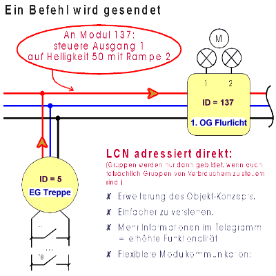 Im Gegensatz zu netzmodulierten Systemen wird dabei eine zusätzliche Steuerader im Netzkabel benutzt, die auf Nulleiter-Potential liegt und damit sowohl ungefährlich ist als auch keine besonderen Maßnahmen wie Phasenkoppler oder Netzstörfilter erfordert. Da alle Module am Netz betrieben werden, entfällt auch die von anderen Bussystemen gewohnte Stromversorgung der Module- sie bedienen sich selbst. Und da LCN Sensor-, Aktor- und Buskopplerfunktion in nur einem Modul kombiniert, gibt es kaum Typenvielfalt: ein Basis-Modultyp reicht für fast alle Aufgaben.