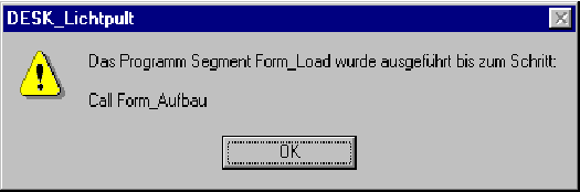 Nach jedem Abschnitt während der Initialisierung frage ich den Parameter ab und gebe dann eine MsgBox aus, in der angegeben wird, wie weit das Programm inzwischen fortgeschritten ist.
