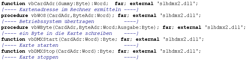 Wenn Sie unsere Karte aus dem Karton nehmen, ist sie "dumm". Das bedeutet: wir müssen ihr erst einmal ein Betriebssystem laden, damit sie DMX ausgeben kann, und dann müssen wir die Funktionen deklarieren, mit denen wir dies Betriebssystem ansprechen. Auch das Laden des Betriebsprogramms kann durch eine dieser Funktionen erfolgen. Sie sind in einer datei namens SLHDMX2.DLL gespeichert, die als Windows Laufzeitbibliothek geladen wird. Bevor die Funktionen einer DLL genutzt werden können, müssen sie der Programmierumgebung bekanntgemacht werden, sie müssen deklariert werden.