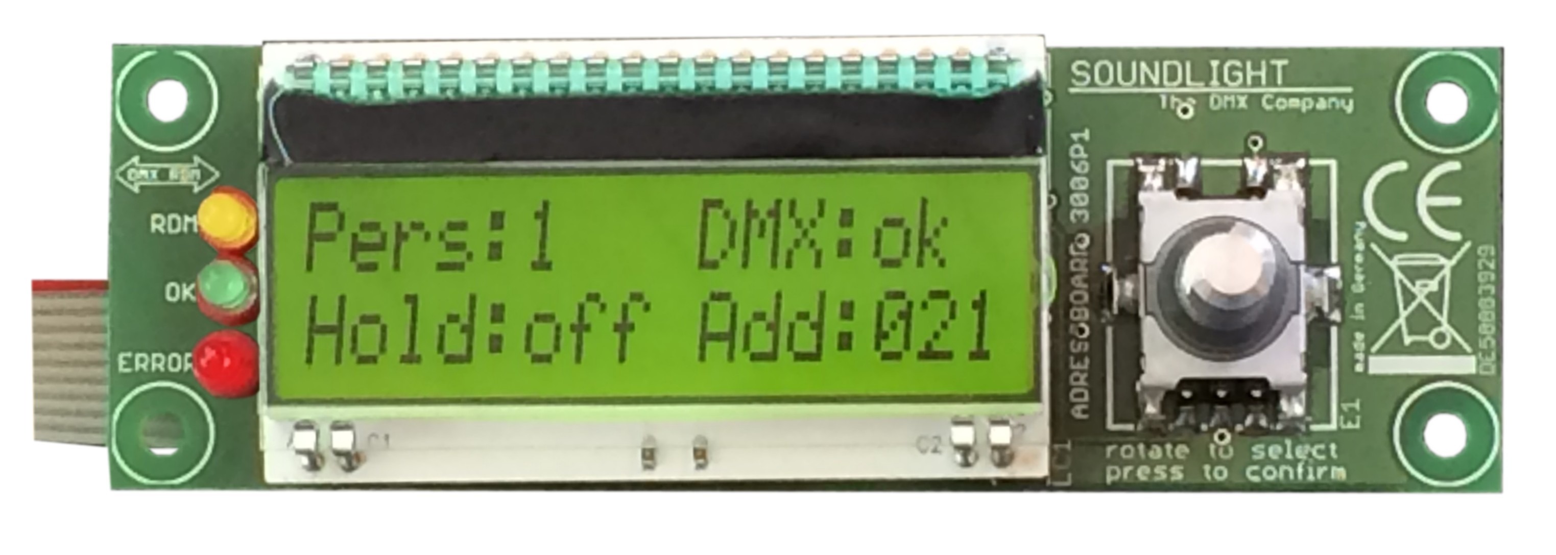 The start address board 3006P-SD is a special version of the standard part 3006P. It has been designed to setup interfaces using DMX RDM Subdevice mode. The 3006P-SD is equipped with a backlight illuminated 2-line liquid crystal display. The start adress board can be used in conjunction with all DIN rail RDM decoders listed below. All settings are menu driven. Simply turn the encoder to select your option, then click to confirm or to exit. Additional configuration options include DMX HOLD mode, DMX personality, display contrast and backlight intensity. Coloured LEDs indicate DMX status and error conditions. The 3006P-SD is DMX RDM compatible and can read from RDM decoders.