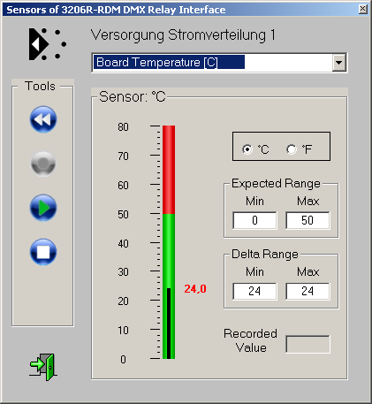 BETRIEBSTEMPERATUR Der Spannungssensor dient zur Überwachung der Betriebstemperatur. Er verfügt gleichzeitig über die Möglichkeit des (rückstellbaren) Langzeit-Monitorings (Min/Max). Aufgenommen mit JESE GET/SET RDM CONTROLLER |