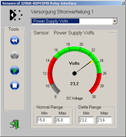 VERSORGUNGSSPANNUNG Der Spannungssensor dient zur Überwachung der Betriebsspannung. Er verfügt gleichzeitig über die Möglichkeit des (rückstellbaren) Langzeit-Monitorings (Min/Max). Aufgenommen mit ENTTEC RDM CONTROLLER |