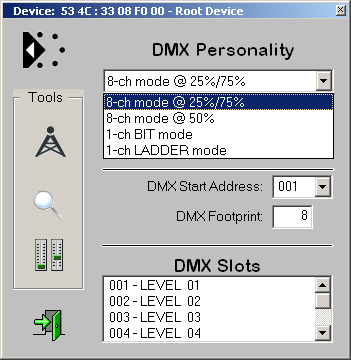 DMX PROPERTIES DMX RDM properties can be read by any RDM controller. Shown: start address and personality settings. Aufgenommen mit JESE GET/SET RDM CONTROLLER |