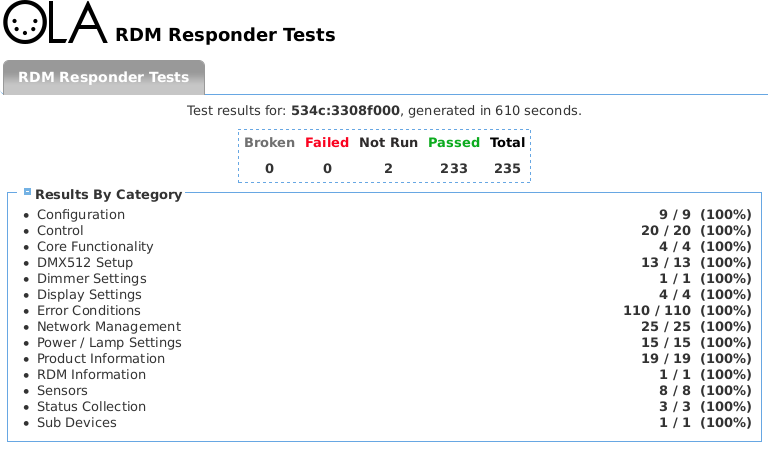 RDM TEST REPORT The official RDM Test report unveils 100% RDM compatibility. Since operating hours and startup counters are not resettable, the report issues a advisory message. Recorded using OLA RDM Responder Test |