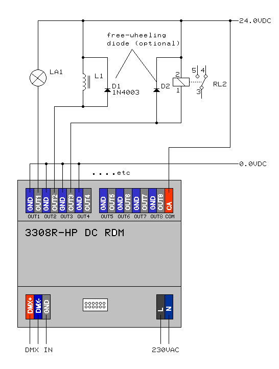 WIRING Refer to the wiring scheme to connect the 3308R-HPDC. The outputs drive DC loads (typ. 24VDC). The interface is fitted with integrated free-wheeling diodes to drive resistive loads or inductive loads similarly. |