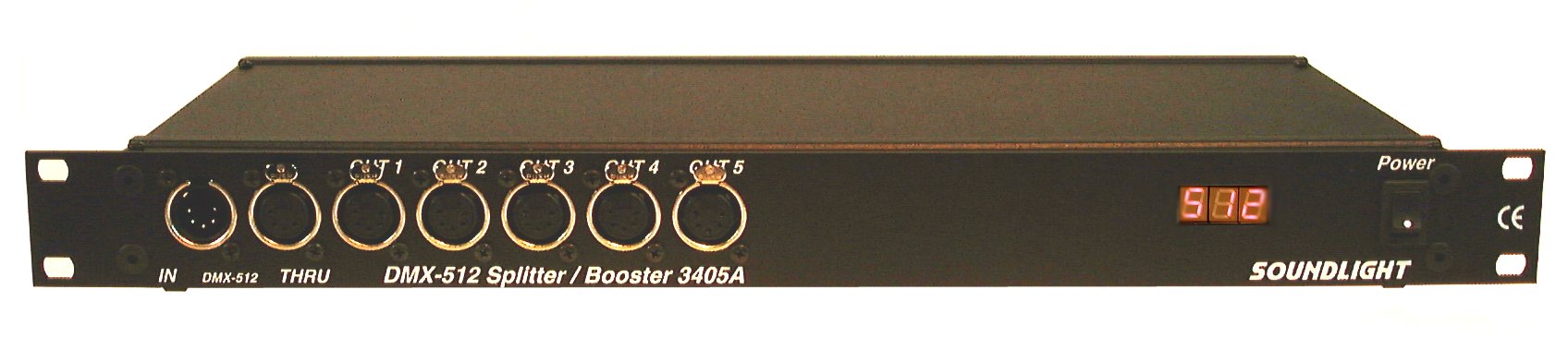 ![]() The 3405A-FG is a DMX splitter for rack mount use and provides five independent, individually optical isolated output ports. Since the outputs are electrically isolated in respect to the data input, a hazard on any ouf the output lines will neither affect the controller, nor DMX IN or DMX THRU data. This dramatically improves overall system stability and system reliability. SIGNAL ANALYSIS While the DMX splitter does not modify DMX signal contents or timing parameters, it monitors the signal. Detection of valid DMX data and DMX data slot count is displayed.