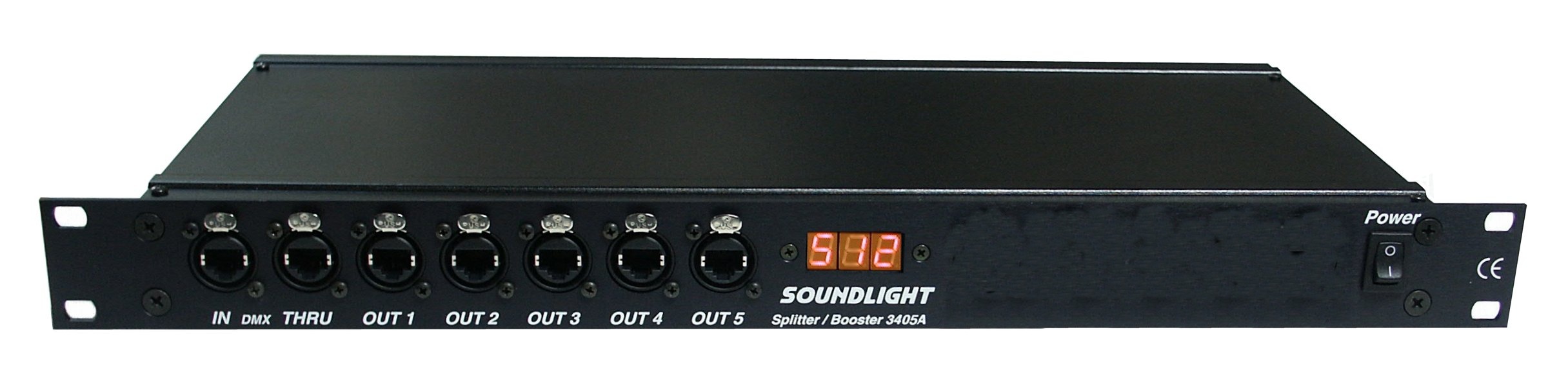![]() The 3405A-FG is a DMX splitter for rack mount use and provides five independent, individually optical isolated output ports. Since the outputs are electrically isolated in respect to the data input, a hazard on any ouf the output lines will neither affect the controller, nor DMX IN or DMX THRU data. This dramatically improves overall system stability and system reliability. SIGNAL ANALYSIS While the DMX splitter does not modify DMX signal contents or timing parameters, it monitors the signal. Detection of valid DMX data and DMX data slot count is displayed.