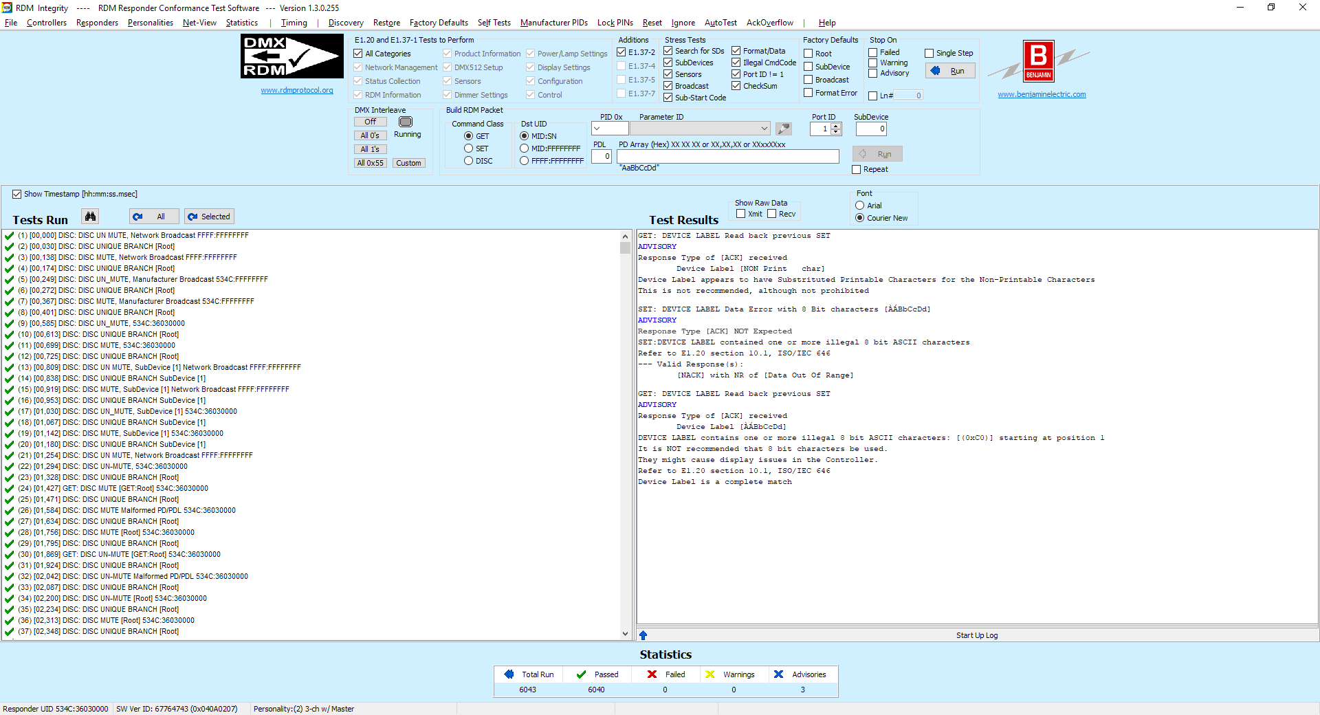 RDM TEST REPORT Der OLA RDM Test Report zeigt: die 3603PWM-H ist 100% RDM kompatibel. Betriebsstunden-Zähler und Reset-Counter sind bei unseren Interfaces nicht rückstellbar. Aufgenommen mit OLA RDM Responder Test |