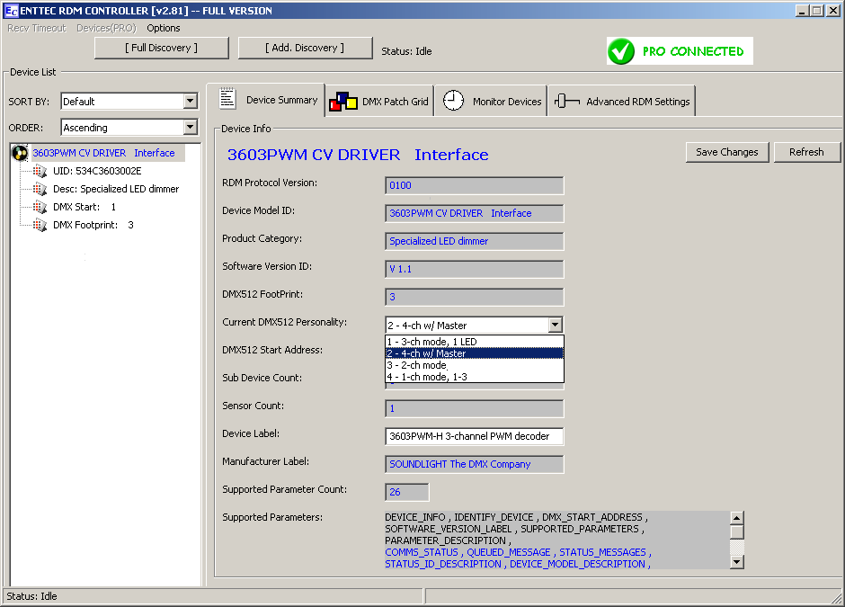 MAIN MENU DMX start address, DMX personality and all device specific labels can be found in the main menu. Recorded using ENTTEC RDM CONTROLLER |