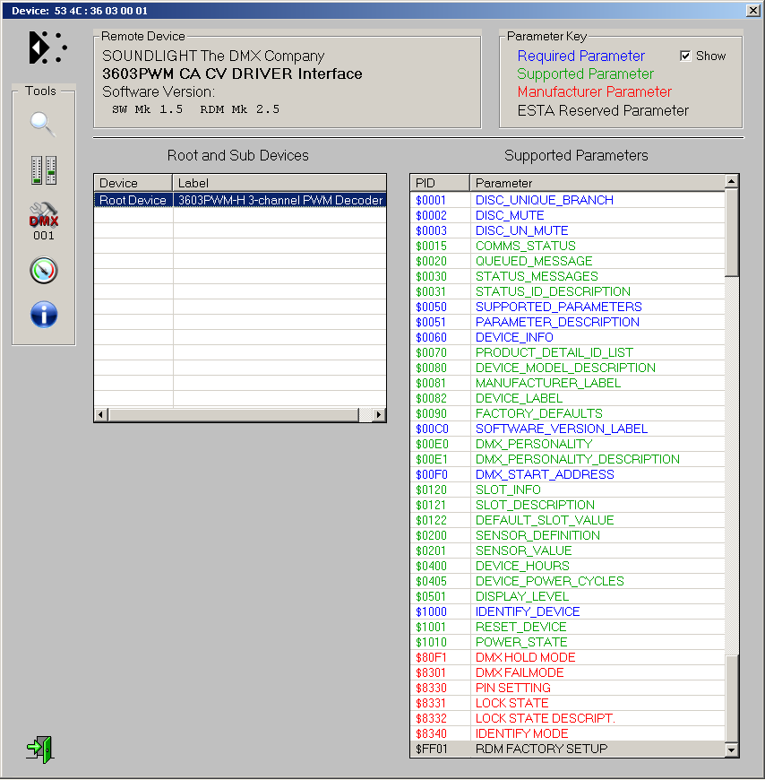 Die aktuelle Version der 3603PWM-H ist DMX RDM kompatibel. Damit stehen Ihnen zahlreiche Möglichkeiten zur Verfügung, das Interface zu konfigurieren und zu administrieren. | The current version of the 3603PWM-H is fully RDM compliant. This gives you a wealth of new functions and possibilities to configure and administer the interface. | ||