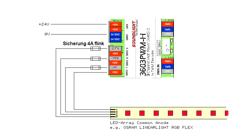 WIRING Refer to the wiring scheme how to connect LEDs. You can use voltage driven LEDs, and the supply voltage must match the LED operating voltage. LED-assemblies must follow a common anode layout. 12V or 24V strings can be used. |