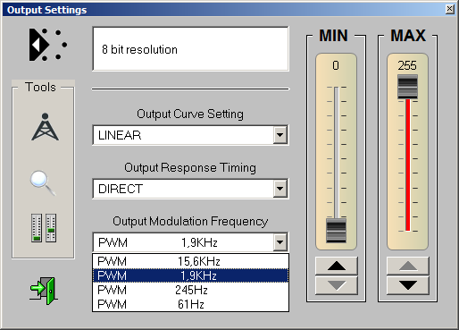 The high-speed PWM output (selectable from 244Hz to 15,6 kHz) and the quasi-logarithmic intensity characteristic ensure best performance for