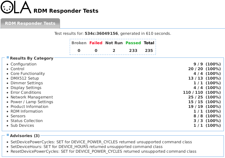 Die uneingeschränkte DMX RDM Kompatibilität des Decoders wird durch den OLA Test Report belegt.