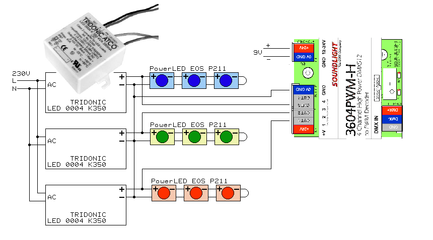 Kaum zu glauben und optimal für Schaltanlagen: 4 Hochleistungs-Steuerkanäle in nur 4 TE Installationsbreite. Bis zu 300W Leistung liefert das Modul bei 24V Versorgungsspannung. Mit der 3604PWM-H lassen sich alle spannungsgesteuerten LED-Baugruppen bedienen, gleich welchen Fabrikats. Gemeinsames Kennzeichen: Spannungsversorgung zwischen 12 und 24V, und bei mehreren angeschlossenen LEDs muss eine gemeinsame Anode vorhanden sein (gemeinsamer „+“ für alle LEDs). Für ein augenfreundliches Verhalten sorgt die integrierte High-Speed PWM-Steuerung mit einer Frequenz von 240 Hz. Damit Sie einen Vergleich haben: das ist etwa viermal schneller, als die beste Einstellung, die Sie an Ihrem PC für einen flickerfreien Bildschirm vornehmen können. Und für den optimalen DMXEmpfang haben wir auch etwas getan: obwohl aufwändiger und deutlich teurer, bestücken wir unsere Baugruppen mit speziellen SLR-Empfängern, die über eine erhöhte Störsicherheit und verbesserte Empfangseigenschaften verfügen. Gleichzeitig belasten sie den DMX-Bus nur mit einem Viertel der Last eines konventionellen Schaltkreises – das kommt der Performance Ihrer gesamten Anlage zugute.