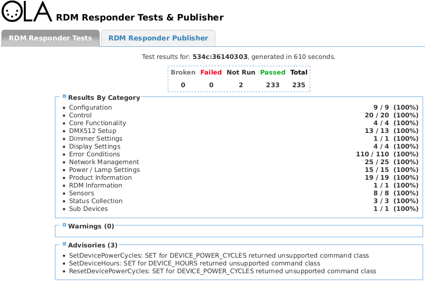 The RDM integrity test checks all RDM calls using 318 tests. The result speaks for itself: 100% passed.