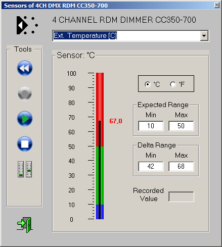 LED TEMPERATURE The connected LEDs can be monitored by an external sensor. When reaching the pre-selected maximum temperature, output power will be decreased slowly to prevent damage of the power LEDs. Recorded using JESE GET/SET RDM CONTROLLER |