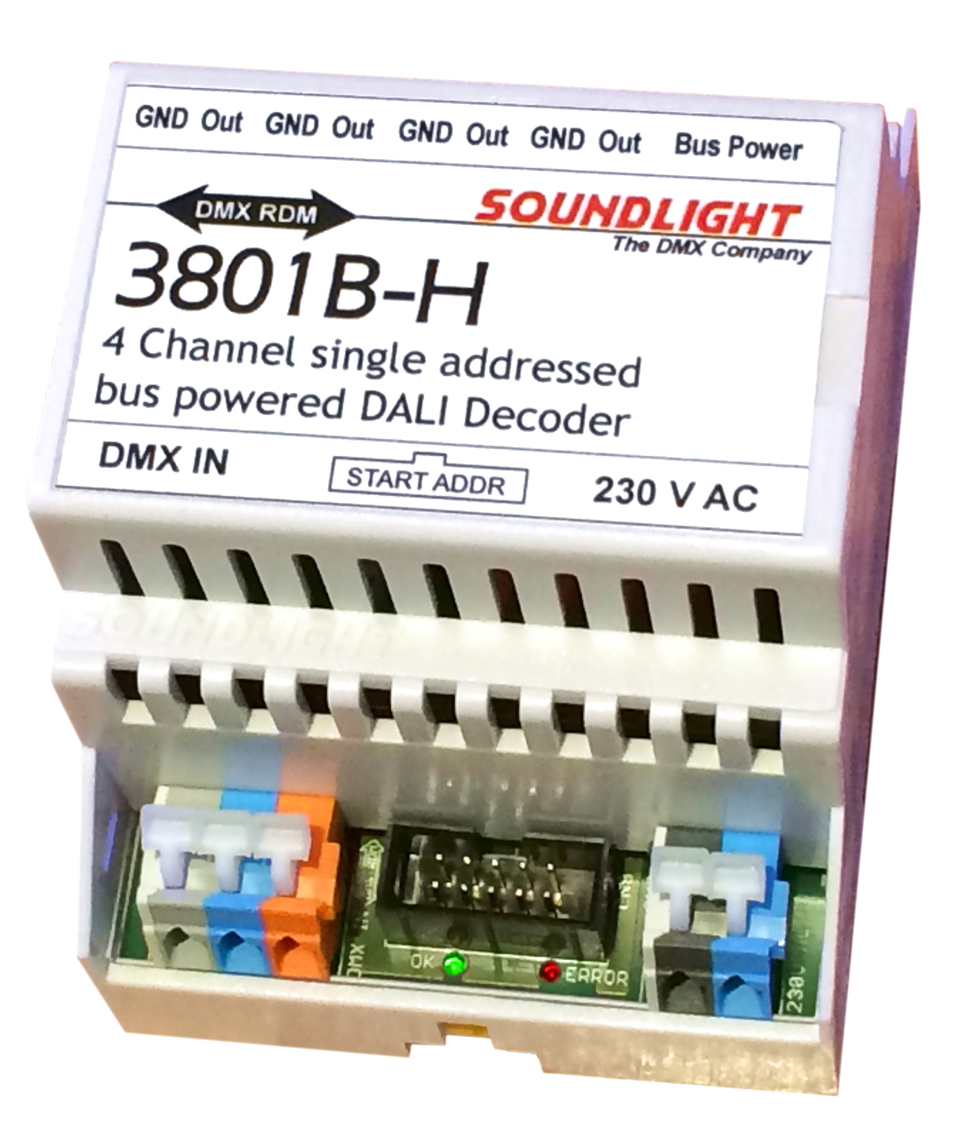 The 3801B-H is intended for permanent installations. Thus it does not have any configuration switches. All settings can be programmed using DMX RDM or, if you do not have access to a DMX RDM controller, a standard start address board 3000P, 3003P, 3005P, or 3006P, which is available as as separate accessory. The 3801B-H supports the DALI output protocol and can be configured to match either a 1%...100% or a extended 0,1%...100% DALI control range.