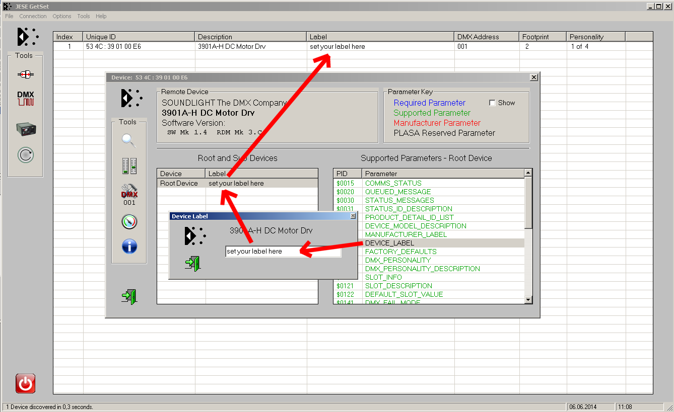DEVICE LABEL Jedes Gerät kann eine eigene Gerätebezeichnung (DEVICE LABEL) bekommen. Klicken Sie die Funktion Device Label und geben Sie den gewünschten Text ein. Er erscheint dann in der Parameterliste und in der Geräteübersicht. Aufgenommen mit JESE GET/SET RDM CONTROLLER |