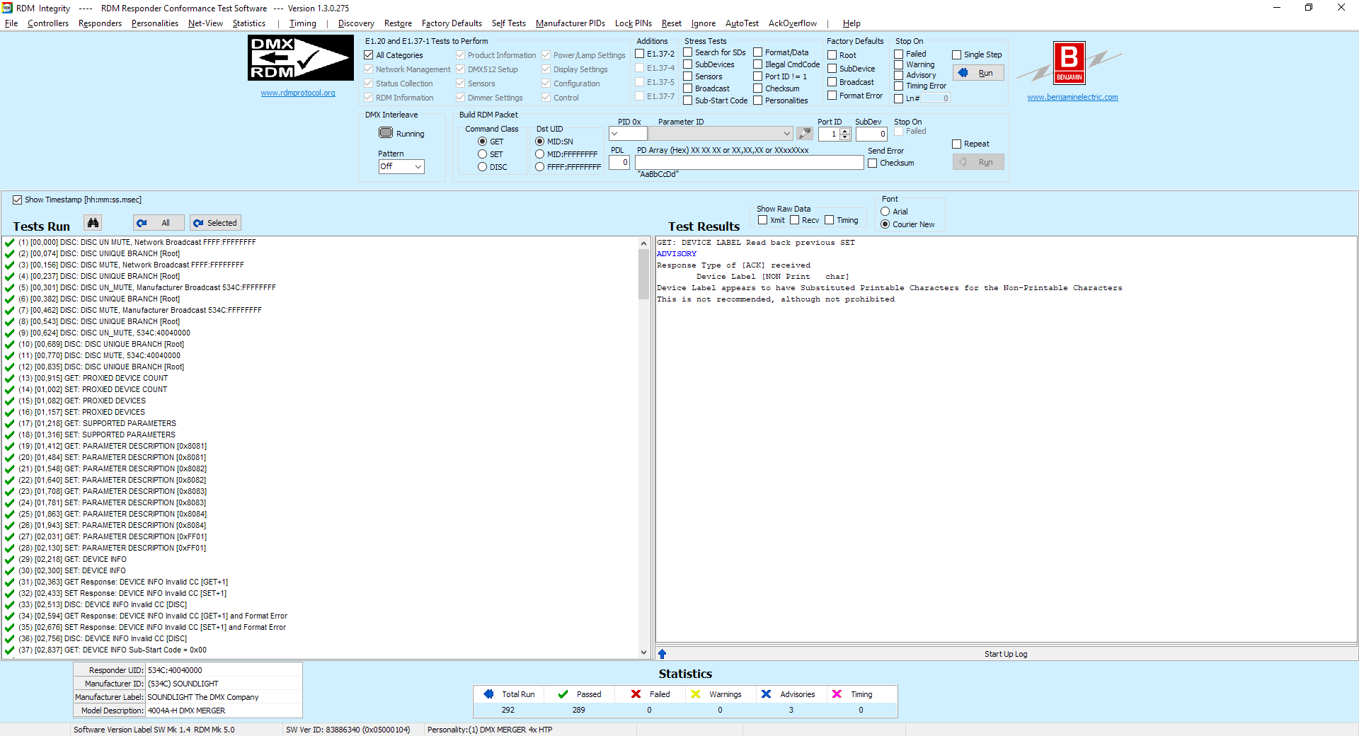 RDM KONFORMITÄTS-REPORT Der RDM Konformitäts-Test prüft auf falsche Formate, falsche Parameter, falsche Befehle. Den 4004A-H kann nichts aus der Bahn bringen: Alle Tests fehlerfrei absolviert! Wenn Sie einen Decoder finden, der das auch kann: sagen Sie es uns! Damit sollte der 4004A-H eindutig einer der stabilsten RDM gesteuerten DMX Merger sein, die Sie am Markt finden können. Aufgenommen mit RDM Integrity Software |