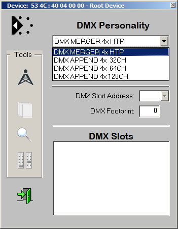 In personalities 1-4, the DMX merger 4004A-H does not occupy any DMX data slots itself. Thus a DMX RDM controller will neither show a DMX start address nor a DMX slot allocation. The personality, however, can be changed. |