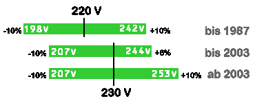 Mittlerweile ist die allgemeine Umstellung auf 230V abgeschlossen. Nun erfolgt -bis zum Jahr 2003- eine Erweiterung der Toleranzgrenzen auf wieder +/-10%, der Wert für die die maximale Spannung wird (für uns) somit angehoben. Die nachfolgende Grafik verdeutlicht dies: